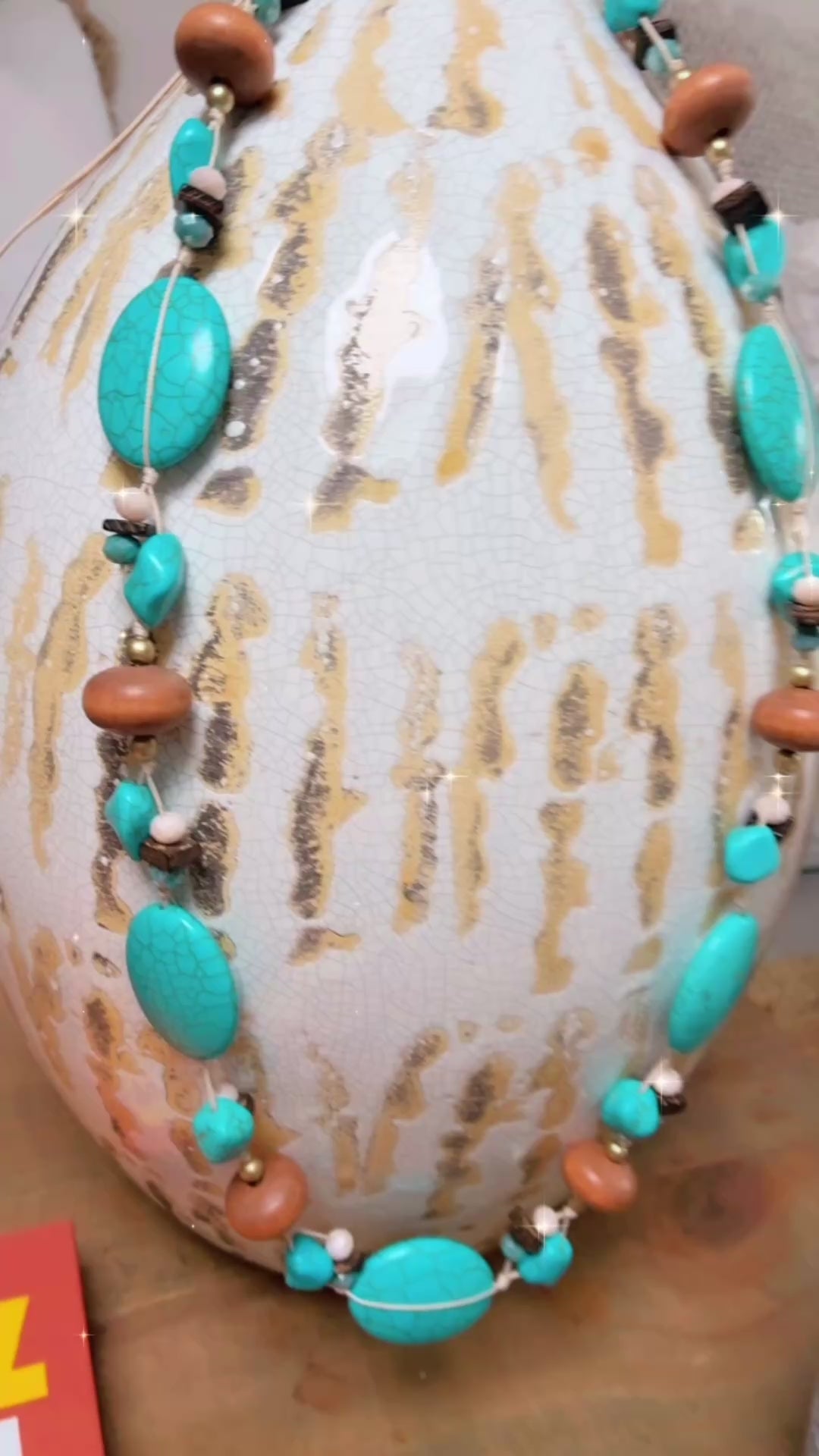On adore ce Joli sautoir pierres turquoises et bois qui illuminera vos tenues !