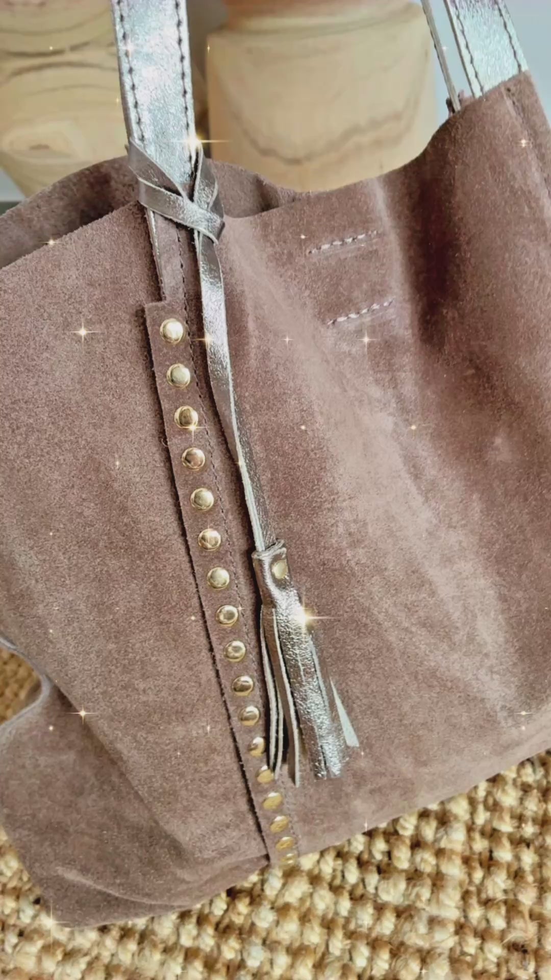 Découvrez le Sac cuir effet daim clouté or BOSTON de VIMODA Paris. Fabriqué en cuir taupe de haute qualité, ce sublime sac offre une grande contenance et est doté d'une double anse mordoré en cuir pratique pour un transport facile. Avec sa pression de fermeture et ses rangements intérieurs, il allie style et praticité.