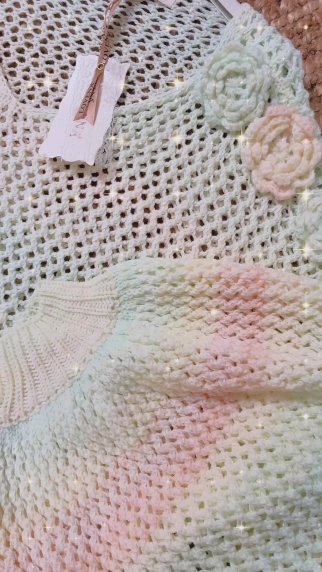 Découvrez le pull glamour arc-en-ciel RAINBOW, confectionné en crochet de coton. Avec son col en V et ses fleurs délicatement crochetées aux épaules, ce pull offre à la fois une esthétique tendance et une touche de féminité.
