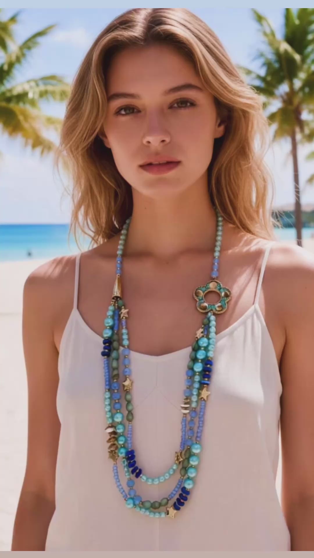 On adore ce Joli sautoir pierres turquoises et bleues multirangs  qui illuminera vos tenues !